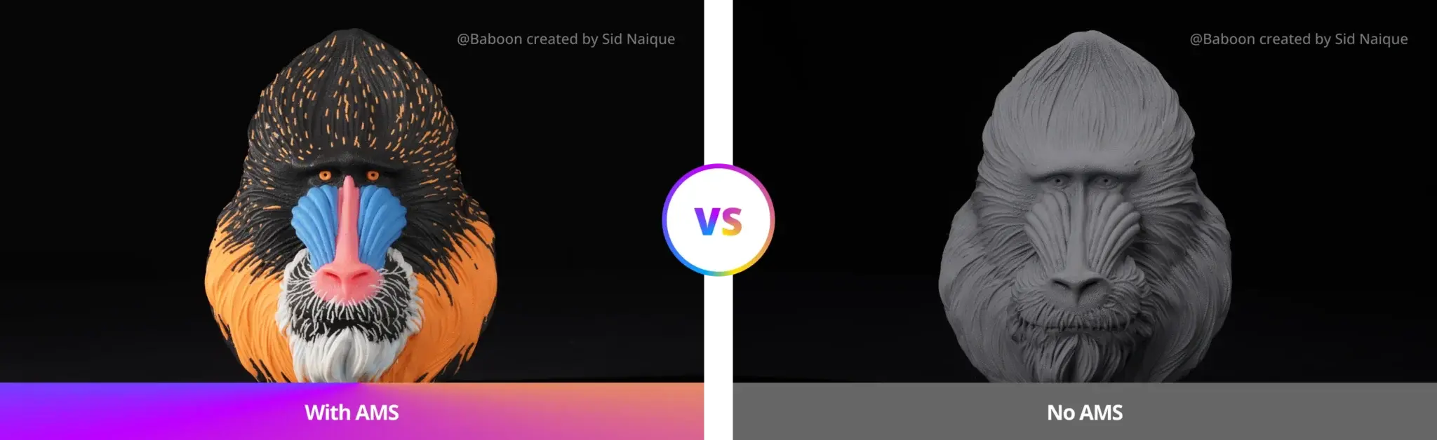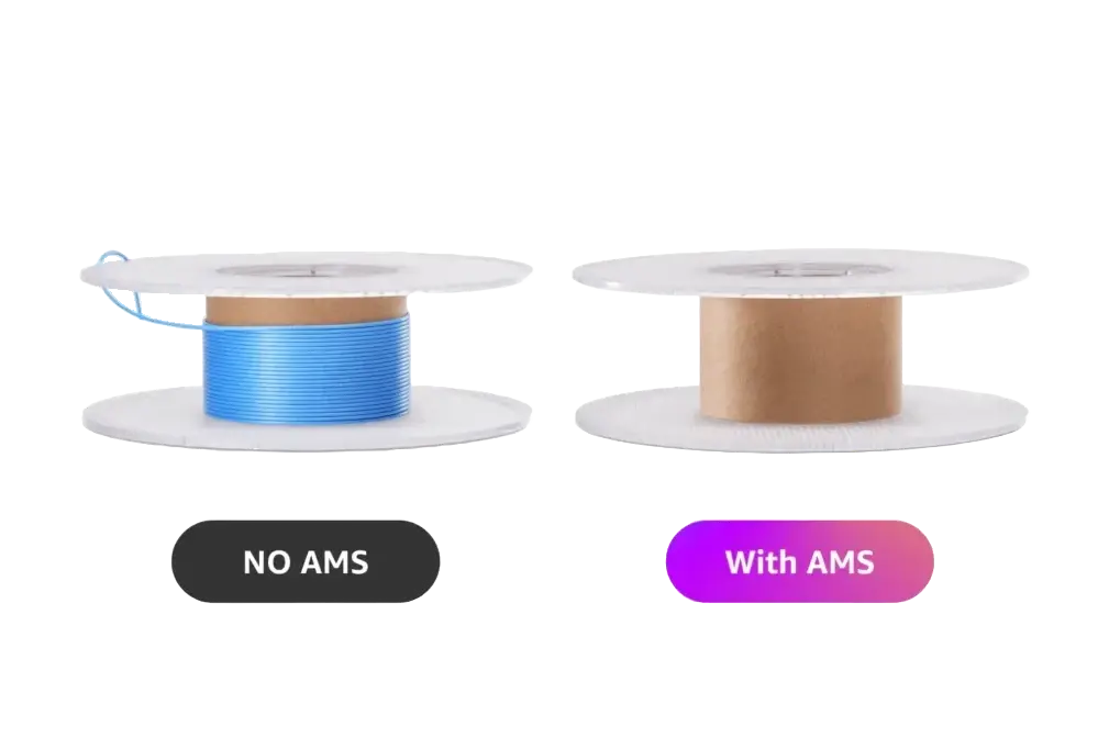 Uden AMS kræver manuel udskiftning af spolen, at udskrivningen afbrydes, når filamentet løber tør, hvilket resulterer i unødvendigt spild af filament. Med AMS sikres en gnidningsfri overgang til en ny spole, hvilket muliggør uafbrudt udskrivning og minimerer spild.