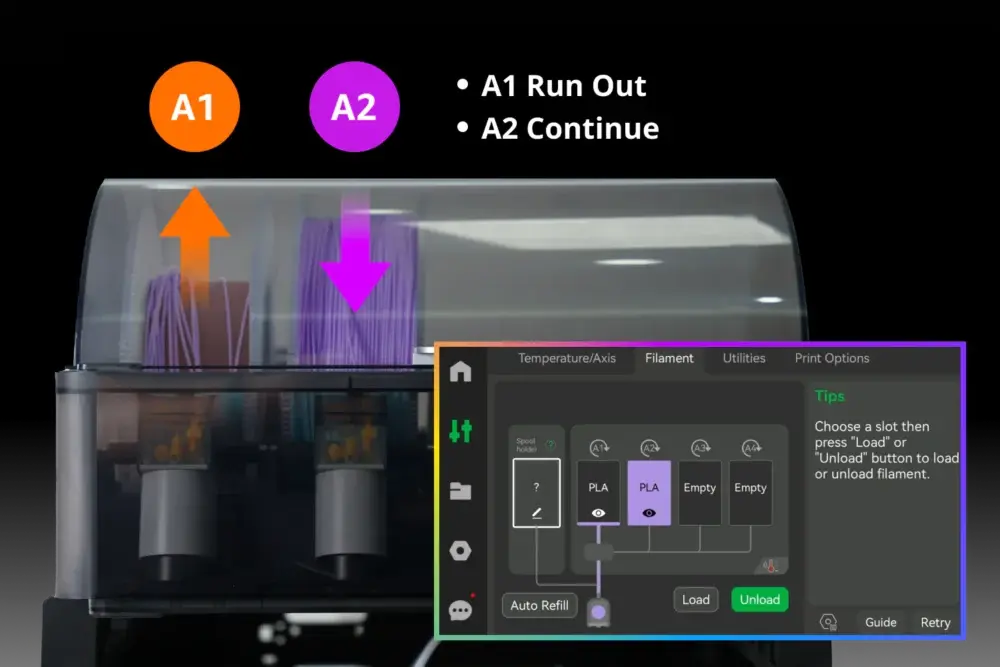 Din udskrivning stopper aldrig takket være automatisk spoleskift. Med AMS’ backup-funktion behøver du aldrig bekymre dig om at løbe tør for filament, selv når du sover eller ikke er til stede. Dette sikrer en gnidningsfri og uafbrudt udskrivningsproces, forhindrer filamentspild og fremmer energieffektivitet.