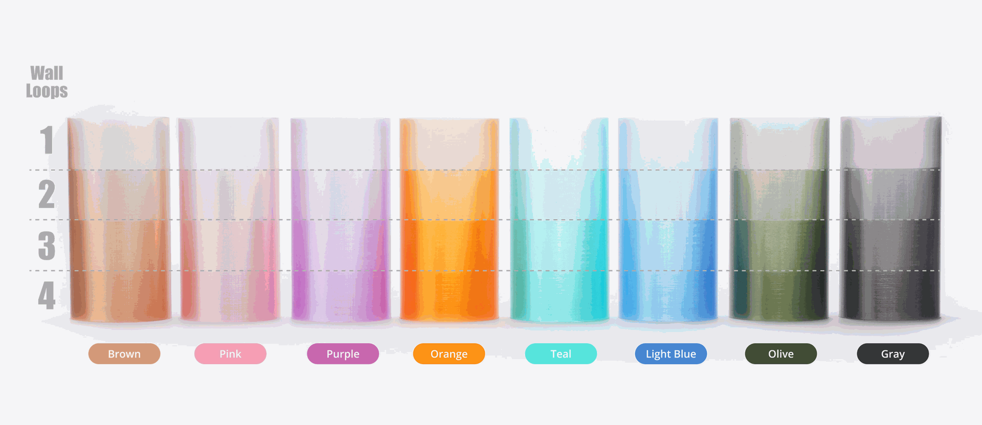 Bambu PETG Translucent tilbyder 8 levende farver at vælge imellem. Løft dine prints ved at blande forskellige farver og eksperimentere med varierende lag- og vægtykkelser for at skabe unikke visuelle effekter.