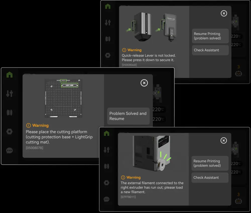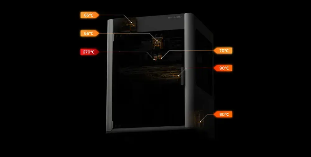 Bambu Lab H2D Combo er udstyret med et lukket kredsløb temperaturstyringssystem for alle opvarmningskomponenter, der konstant justerer temperaturen baseret på realtids-sensordata. Dette sikrer stabil og præcis varmestyring, hvilket holder enheden kørende effektivt og konsekvent inden for optimale temperaturområder.