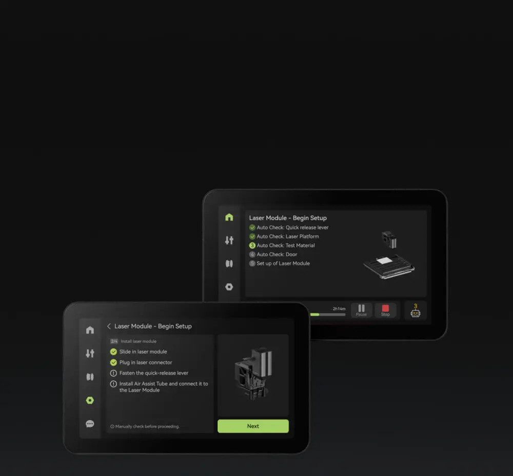 Et enkelt tryk starter automatisk laserfokusverifikation og materialemåling, hvilket eliminerer manuelle justeringer.